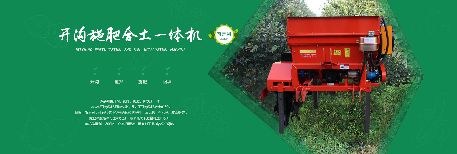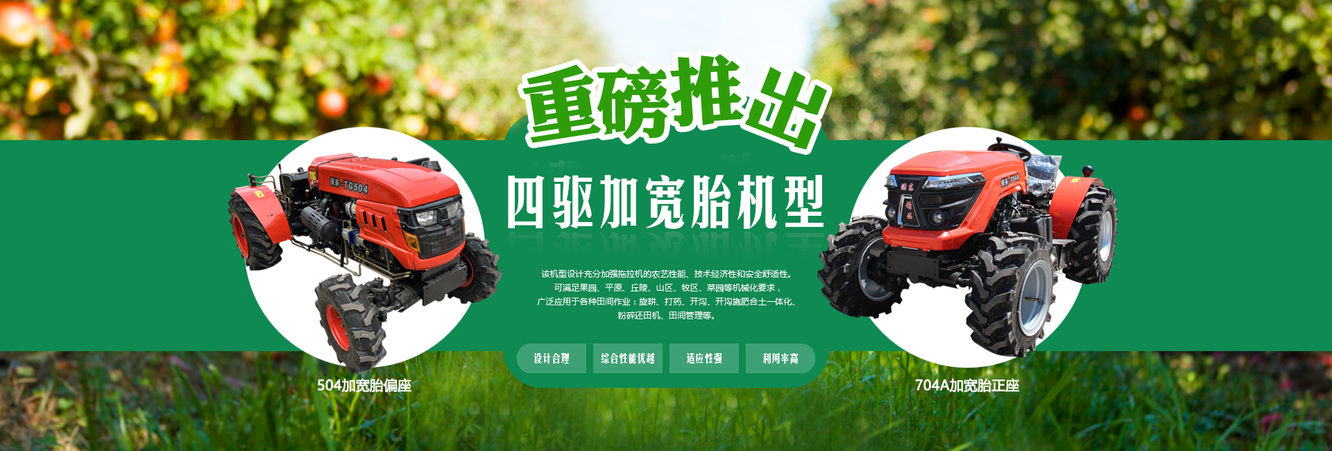 我公司主要經(jīng)營(yíng)產(chǎn)品有:果園管理機(jī)、拖拉機(jī)(窄距拖拉機(jī)、小型拖拉機(jī)、輪式拖拉機(jī)、山地拖拉機(jī)、四驅(qū)拖拉機(jī))、果園施肥機(jī)(開(kāi)溝施肥合土一體機(jī)、偏置開(kāi)溝施肥復(fù)土一體機(jī))、打藥機(jī)(風(fēng)送噴霧打藥機(jī)、小型風(fēng)送噴霧打藥機(jī)、大型風(fēng)送噴霧打藥機(jī)、果園打藥機(jī))、開(kāi)溝機(jī)(中開(kāi)溝機(jī)、偏置開(kāi)溝機(jī)、果園開(kāi)溝機(jī))、粉碎還田機(jī)、果園打草機(jī)、碎枝機(jī)(大型碎枝機(jī)、開(kāi)荒機(jī)、山地開(kāi)荒機(jī))、旋耕機(jī)(1米旋耕機(jī)、1.2米旋耕機(jī)、1.3米旋耕機(jī)、1.4米旋耕機(jī)、1.5米旋耕機(jī)以及偏置旋耕機(jī))、雙鏵犁等。不斷研制出適應(yīng)國(guó)內(nèi)現(xiàn)代化果園需求的果園裝備系列產(chǎn)品,并取得國(guó)家多項(xiàng)專利。
