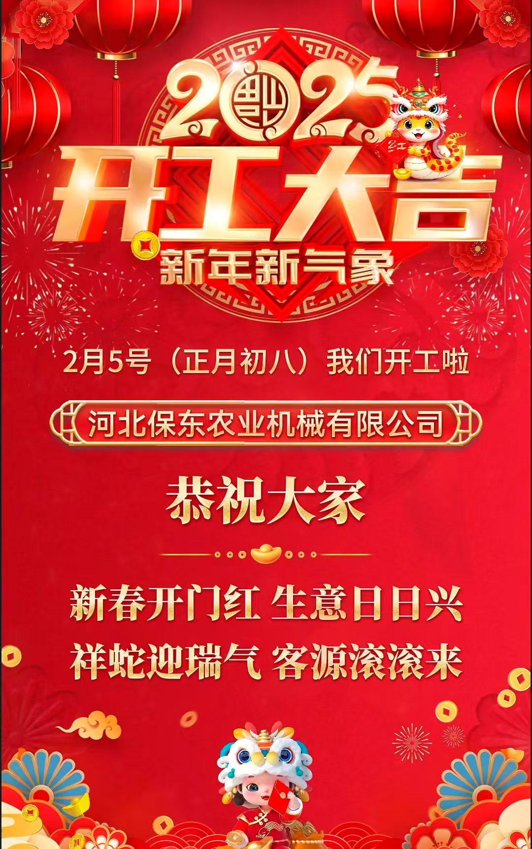 靈蛇騰云開(kāi)盛景春風(fēng)浩蕩展宏圖只爭(zhēng)朝夕加油干斗志昂揚(yáng)創(chuàng)未來(lái)正月初八 河北保東開(kāi)工大吉!在新的一年里河北保東將一如既往為廣大果園、大棚